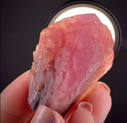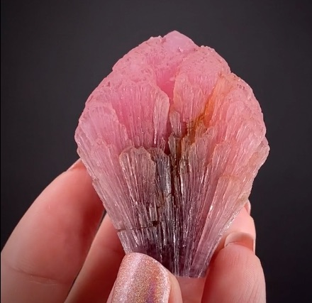 This is a luscious, deep raspberry pink, "mushroom cap" Tourmaline from Burma from the Palelni pegmatite mine, a classic old tourmaline discovery of the 1990s. These uncommon, stylish Elbaite crystals exhibit a distinct form with a larger, barely discernible crystal in the center with numerous, divergent, crystals tightly packed, in parallel growth against it. These have an ethereal translucency to them with their raspberry pink exterior and a darker ghostly interior for added effect. An attenuated triangular shape is evident looking down the c-axis which is also unique to these. This one also displays an overall satin luster with the thin, parallel, component prisms having a higher luster resulting in a fan-like scintillation along the length of the crystal. Very aesthetic!
