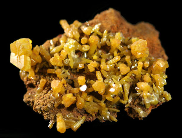 Rob: BRIGHT yellow crystals of several different crystal forms on the same piece; with elongated crystals to 1.2 cm sprinkling a contrasting matrix capped by 1.5 cm lemon yellow crystals atop! One of the most unique pieces in the lot, compared to the 'norm', and with great aesthetics! ----- Photos ©2006 Richard Geiger