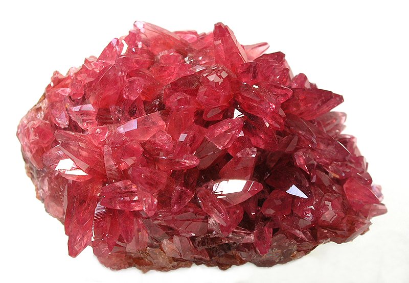A 1982 find, Rob Lavinsky tells me these were called 'cherry rhodos' at the time, due to the unique and beautiful color of the crystals. The crystals are sharp, densly packed and somewhat intergrown. The orientations of the crystals are quite irregular, with the result of making the specimen very sparkly overall - there are faces at many different angles across a wide range. The color is between the dark red of the 1977 pocket, and the brighter and more luminous red of a Nate's Pocket peice form the Sweet Home mine. Ex. Tom Hall collection, then Rob, another collector, back to Rob, and now me.
