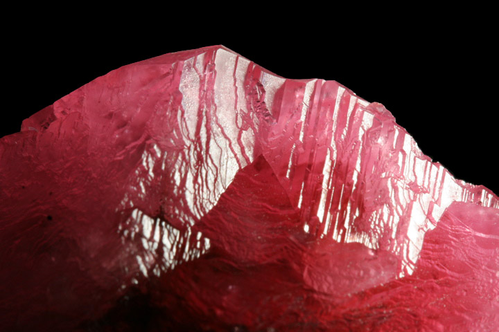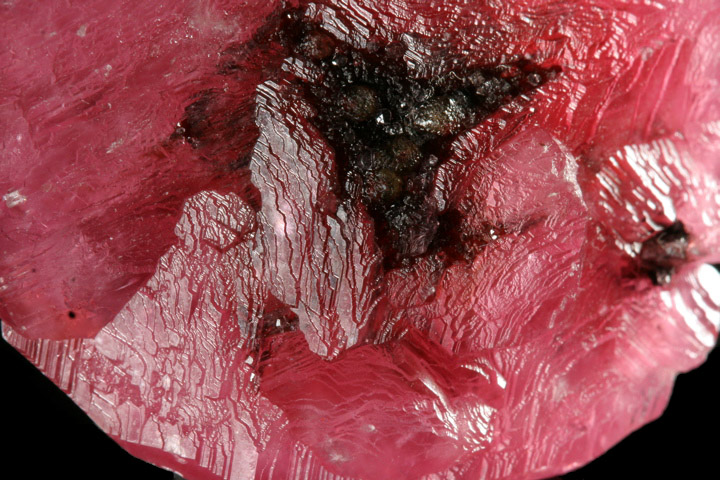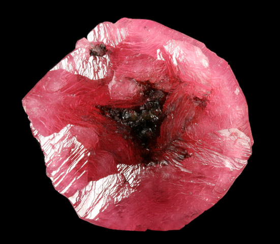 ex. Cal and Kerith Graeber Collection An amazingly unique piece, this Rhodo is a floater specimen, pristine all around except perhaps for a single bruise at one point around the rim, visible only with 10x magnification. The Rhodochrosite surrounds a core of black Geothite, tapering from thickest at the center of the disc, and tapering evenly out to a sharp edge with a gorgeous slightly-rough symmetry all around. The Rhodo is a deep rose color with good transparency. An intricate (and fascinating with magnification) stepping pattern on the crystal surfaces lends a juicy, satiny luster that just grabs the eye. ----- Photos ©2006 Richard Geiger