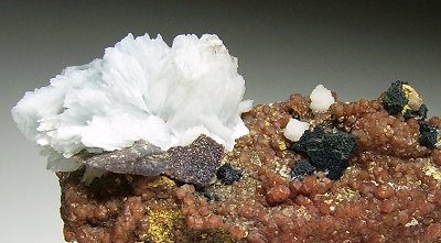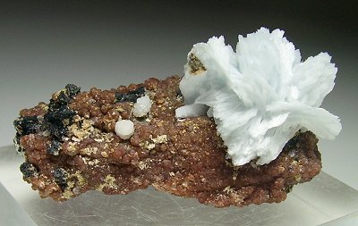ex. John I. Schneider, Jr. #1162 w/data card Trinity Minerals dealer label IC Minerals dealer label Notes from the Schneider data card:There is a spray of pale blue white xls on a red andradite matrix w/ black hausmanite xls and an unknown material. I have adopted the standard name; previous labels used 'Celestite'. ----- Photos courtesy of / ©2006 Trinity Mineral Company