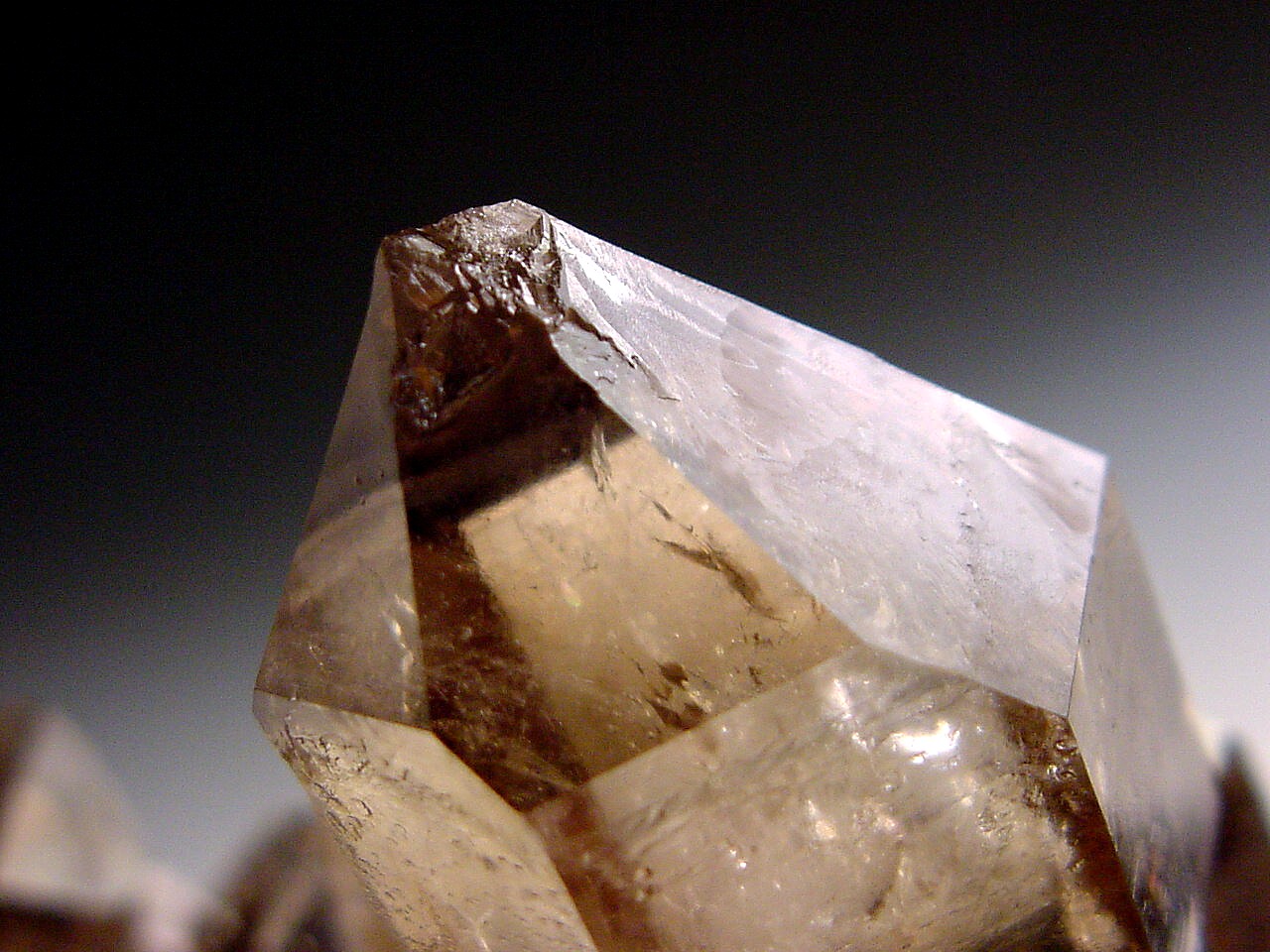 Collected by my daughter Lani Geiger, May 30, 2007 We believe that the irregularity at the tip was due to disrupted growth (rather than caused by damage). Lani recalls that this plate was collected 'blind' in the pocket - too deep to see at all, so she was operating in by-feel mode, only. If anyone else had pulled it out, it would have immediately been announced to all those digging nearby; but Lani quietly just set it into her flat and continued collecting the pocket. I am told that Eric did quite a double take when he walked by and noticed it sitting there! While this locality produces good scepters in relative (for scepters!) profusion, I understand that good matrix scepters are few and far between. At the point that this came out, midway through the dig, it was deemed second best of the dig. - ----- photos courtesy of/©2007 Cascade Scepters