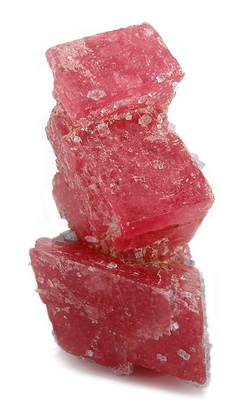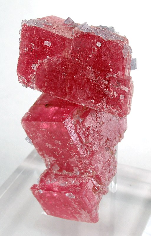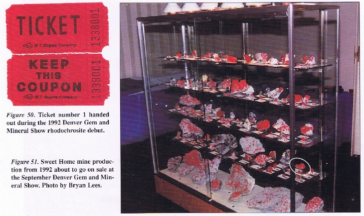 Collector's Edge SH830 ex. Clara and Steve Smale collection The Smales were among the first in line to the Collector's Edge booth in Denver at the 1992 show, and chose this as the best of the specimens available from that first 'big' season of mining. This piece lived, presumably, within a few feet of the largest known euhedral rhodochrosite cystal, The Alma King, probably for hundreds of millions of years. While the outer surfaces are the lower-temperature material (hence the lack of gemminess, sharpness, and luster shown by specimens from other pockets), the center appears to be quite gemmy and translucent when backlit. I believe that this specimen is visible in the photo (Figure 51) on page 41 of the Sweet Home Mine issue of the Mineralogical Record. First shelf above the bottom of the case, back row, second from the right. While the specimen is very small in the photo, there are several predictable, corresponding features. The size of the specimen, compared to the standard Collector's Edge label, is also a perfect match. The specimen now has the distinction of having been mistakenly placed on the cover of the June 2008 edition of the Journal of Chemical Education. Apparently, Rob has supplied them with a bunch of specimens, but they mistook this one for a fluorite and included it along with eleven other rocks - all fluorites! Note that my specimen 675 is also present. - ----- photos courtesy of/©2007 The Arkenstone