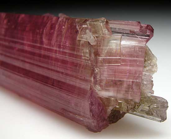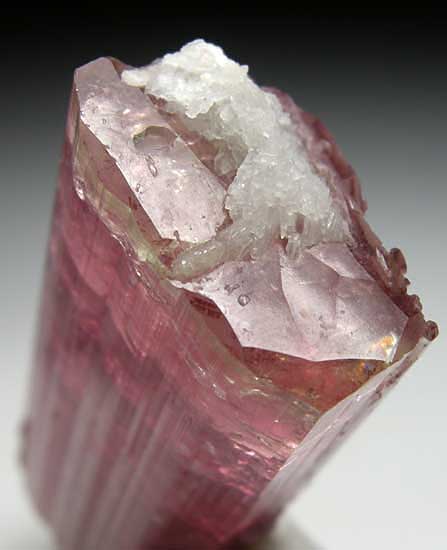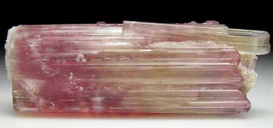 Vivid pink Tourmaline with a light green zone right at the termination. Partially double terminated with good luster, somewhat rectangular in cross-section. - ----- Photos courtesy of/©2009 Marin Mineral Company